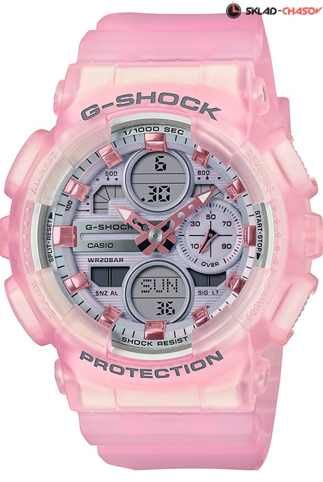 Противоударные женские кварцевые наручные часы Casio GMA-S140NP-4A коллекции G-Shock цифровой+стрелочной индикацией времени. Калибр механизма — 5613. Функциональность данной модели: формат времени 12/24, вечный календарь до 2099 года, функция летнего времени (DST), мировое время 48 городов (29 часовых поясов), 5 независимых будильников, сигнал начала часа, секундомер с точностью 1/1000 секунды и измерением до 99 часов 59 минут 59,99 cек., функция расчета средней скорости движения, таймер обратного отсчета (диапазон времени 24 часа), диодная подсветка циферблата с функцией авто (включается при наклоне часов на 40°) и возможностью выбора продолжительности свечения (1.5 или 3 секунды) + необритовое (Neobrite) покрытие на стрелках для длительного послесвечения в темноте. Водонепроницаемость WR200 (20 атм).