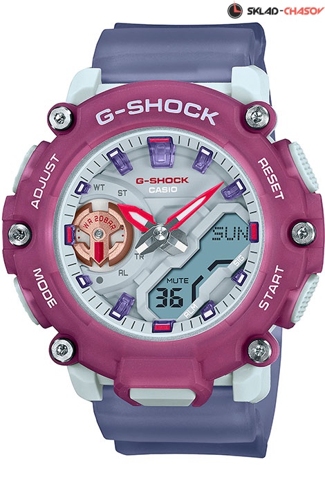 Женские противоударные кварцевые наручные часы Casio GMA-S2200PE-6A коллекции G-Shock с цифровой+стрелочной индикацией времени. Калибр механизма — 5694. Корпус усилен углеродным волокном, изготовленным по технологии Carbon Core Guard. Функциональность данной модели: формат времени 12/24, вечный календарь до 2099 года, функция летнего времени (DST), мировое время 48 городов (31 часовой пояс), двойное время, 5 независимых будильников, сигнал начала часа, секундомер с точностью 1/100 секунды и измерением до 23 часов 59 минут 59 cек., таймер обратного отсчета (диапазон времени 24 часа), двойная диодная подсветка циферблата с возможностью выбора времени свечения (1.5 или 3 секунды) + необритовое (Neobrite) покрытие на стрелках и метках для длительного послесвечения в темноте, функция выключения звука нажатия кнопок (Mute), функция смещения стрелок для удобного просмотра информации на цифровом экране. Водонепроницаемость WR200 (20 атм).