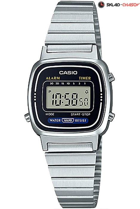 Электронные кварцевые наручные часы Casio Vintage LA670WA-1 с цифровой индикацией времени. Калибр механизма — 3191. Функциональность данной модели: 12-и часовой формат времени, автоматический календарь, будильник, секундомер с точностью 1/10 секунды и измерением до 59 минут 59,99 cек., таймер обратного отсчета (диапазон времени 30 минут), предустановленное время начала обратного отсчета: 1, 3, 5, 10, 15, 20, 30 минут. Стальной браслет. Водонепроницаемость WR (3 атм).