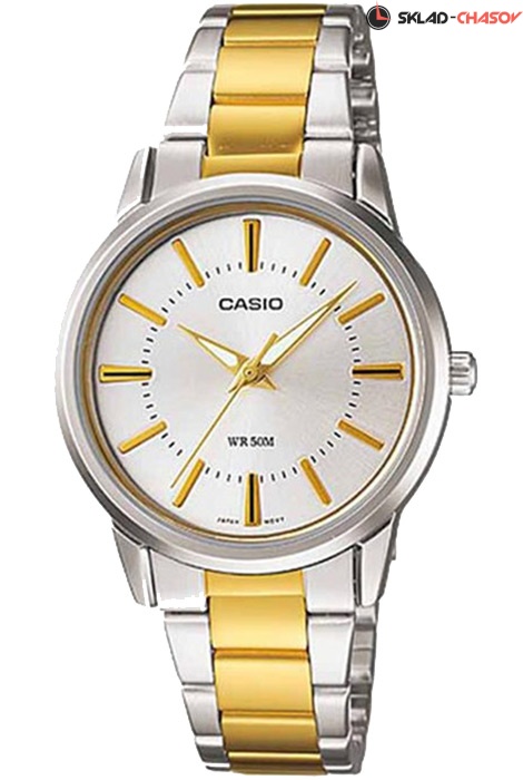 Женские кварцевые наручные часы Casio LTP-1303SG-7A. Калибр механизма — 3363. На данной модели отображается дата. Стрелки покрыты люминесцентным напылением (светятся в темноте). На браслет частично нанесено стойкое PVD покрытие. Водонепроницаемость WR50 (5 атм).
