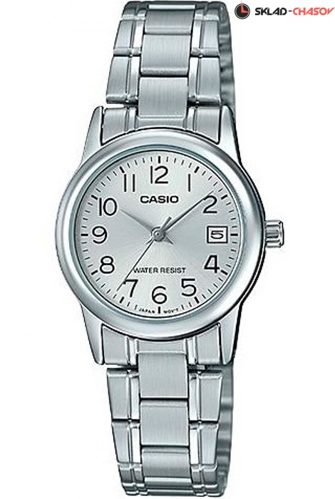 Женские кварцевые наручные часы Casio LTP-V002D-7B. Калибр механизма — 3363. На циферблате присутствует индикация текущей даты. Стальной браслет. Водонепроницаемость WR (3 атм).