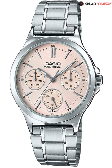 Женские кварцевые наручные часы Casio LTP-V300D-4A. Калибр механизма — 5420. На данной модели отображается день недели, текущая дата и время суток в 24-х часовом формате. Стрелки покрыты люминесцентным напылением (светятся в темноте). Стальной браслет. Водонепроницаемость WR (3 атм).