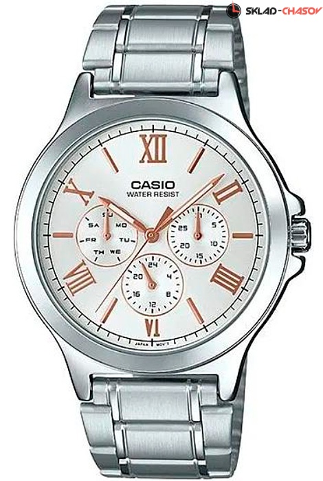 Женские кварцевые наручные часы Casio LTP-V300D-7A2. Калибр механизма — 5420. На данной модели отображается день недели, текущая дата и время суток в 24-х часовом формате. Стрелки покрыты люминесцентным напылением (светятся в темноте). Стальной браслет. Водонепроницаемость WR (3 атм).