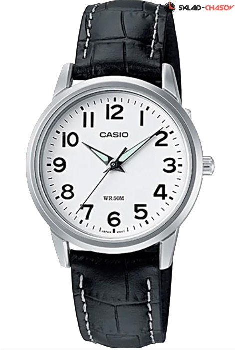 Женские кварцевые наручные часы Casio LTP-1303L-7B. Калибр механизма — 1330. Стрелки покрыты люминесцентным напылением (светятся в темноте). Кожаный ремешок. Водонепроницаемость WR50 (5 атм).