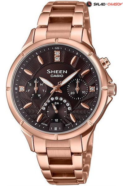 Женские кварцевые наручные часы Casio с подсветкой SHE-3047PG-5A коллекции Sheen. Калибр механизма — 5456. На данной модели отображается дата, день недели и время суток (24-х часовая шкала). Циферблат украшен камнями Swarovski. Яркая диодная подсветка циферблата. Стрелки покрыты люминесцентным напылением (светятся в темноте). На корпус и браслет нанесено стойкое PVD покрытие. Водонепроницаемость WR50 (5 атм).