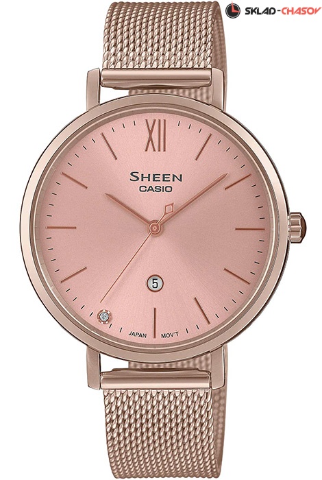 Женские кварцевые наручные часы Casio SHE-4539CM-4A коллекции Sheen. Калибр механизма — 2744. Тонкий корпус часов — 6.4 мм. На циферблате присутствует индикация текущей даты. Текстурный циферблат украшен кристаллом Swarovski. Сапфировое стекло. Стальной браслет миланского плетения. На корпус и браслет нанесено стойкое PVD покрытие. Водонепроницаемость WR50 (5 атм).
