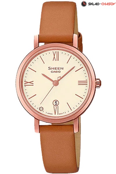 Женские кварцевые наручные часы Casio SHE-4540CGL-9A коллекции Sheen. Калибр механизма — 2744. Тонкий корпус часов — 6.4 мм. На циферблате присутствует индикация текущей даты. Циферблат украшен кристаллом Swarovski. Сапфировое стекло. Ремешок — телячья кожа. На корпус часов нанесено стойкое PVD покрытие. Водонепроницаемость WR50 (5 атм).