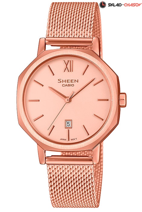 Женские кварцевые наручные часы Casio SHE-4554PGM-4A коллекции Sheen. Калибр механизма — 2718. На данной модели отображается дата. Сапфировое стекло. Стальной браслет миланского плетения. На корпус и браслет нанесено стойкое PVD покрытие. Водонепроницаемость WR50 (5 атм).