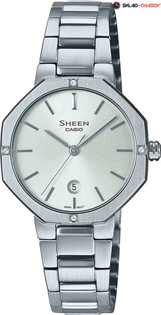 Стильные женские часы Casio Sheen с восьмиугольным корпусом, украшенным кристаллами. Присутствует апертура даты. Водонепроницаемость в соответствии с ISO 22810. Литой браслет из нержавеющей стали с тройной раскладывающейся застежкой, расстегиваемой одним касанием. Вес часов 55 грамм. Гарантия 2 года.
