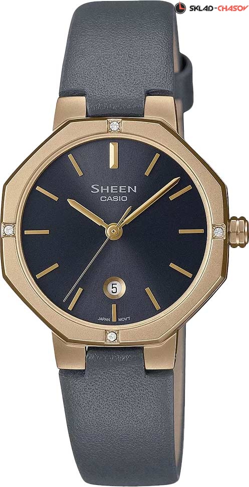 Стильные женские часы Casio Sheen с восьмиугольным корпусом, украшенным кристаллами. Присутствует апертура даты. Водонепроницаемость в соответствии с ISO 22810. Ремешок из натуральной кожи с классической застежкой. Вес часов 22 грамма. Гарантия 2 года.