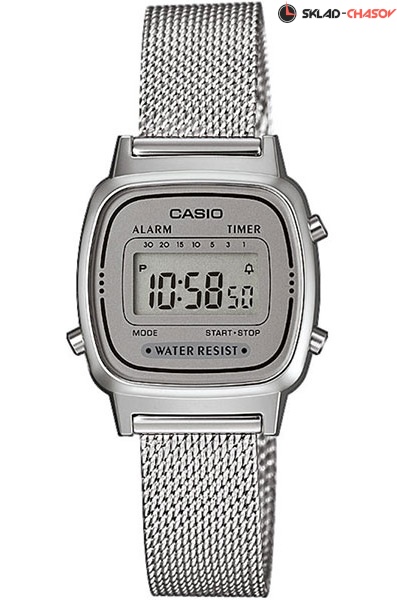 Электронные кварцевые женские наручные часы Casio Vintage LA670WEM-7E с цифровой индикацией времени. Калибр механизма — 3191. Функциональность данной модели: 12-и часовой формат времени, автоматический календарь, будильник, секундомер с точностью 1/100 секунды и измерением до 59 минут 59,99 cек., таймер обратного отсчета (диапазон времени 30 минут). Миланский браслет.