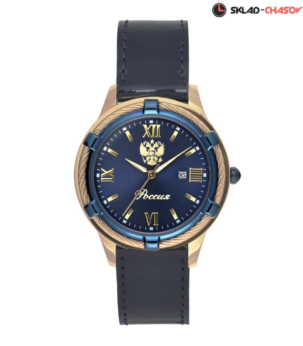 Индивидуальность дизайна часов заключается в выгодном сочетании элементов золотого и синего цвета. Циферблат синего цвета с объемными золотыми часовыми индексами. Корпус из нержавеющей стали имеет высокостойкое покрытие золотого цвета и элементы, покрытые синей эмалью. Завершает образ синий лаковый ремень из натуральной кожи.