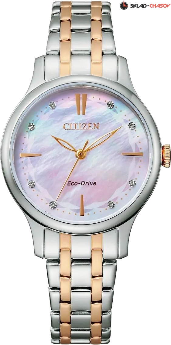 Стильные женские наручные часы с перламутровым циферблатом, украшенном кристаллами. Система Eco-Drive, не требующая замены батарейки. Питание от солнечной энергии, запас энергии на 180 дней. Функция индикации заряда (EOL). Браслет с раскладывающейся застежкой, застежка с системой блокировки. Вес часов 55 грамм. Гарантия 1 год.