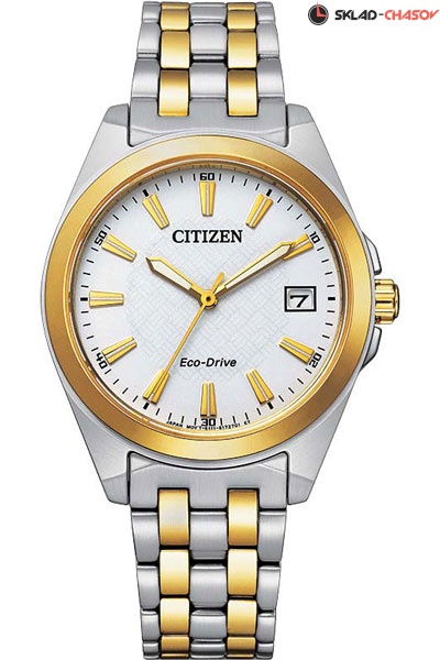 Женские наручные часы Citizen EO1214-82A коллекции Eco-Drive с кварцевым механизмом на солнечной батарее, которая заряжается от любого источника света, будь то солнечный свет или лампочка. Калибр механизма — E111. Срок работы аккумулятора с полным зарядом — до 180 суток. Примерный срок службы аккумулятора — 10 лет. Присутствуют функции информирования о недостаточном заряде и отображения времени (только дата). На корпус и браслет, которые выполнены из нержавеющей стали серебряного и золотого цветов, частично нанесено стойкое PVD покрытие. На циферблате круглой формы белого цвета с метками золотого цвета установлено устойчивое к царапинам сапфировое стекло. Стрелки и метки покрыты люминесцентным напылением, которые светятся в темноте. Водонепроницаемость WR100 (10 атм). Завинчивающаяся задняя крышка.