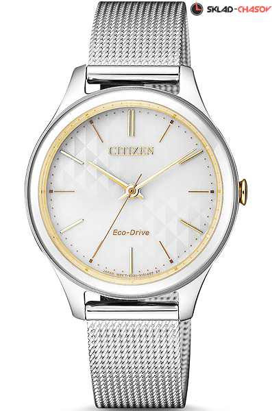 Женские кварцевые наручные часы на солнечной батарее Citizen EM0504-81A коллекции Eco-Drive. Калибр механизма — E031. Аккумулятор данной модели заряжается от любого источника света. Срок работы аккумулятора с полным зарядом — 180 дней. Примерный срок службы аккумулятора — 10 лет. Миланский браслет. На корпус частично нанесено стойкое PVD покрытие. Водонепроницаемость WR50 (5 атм).