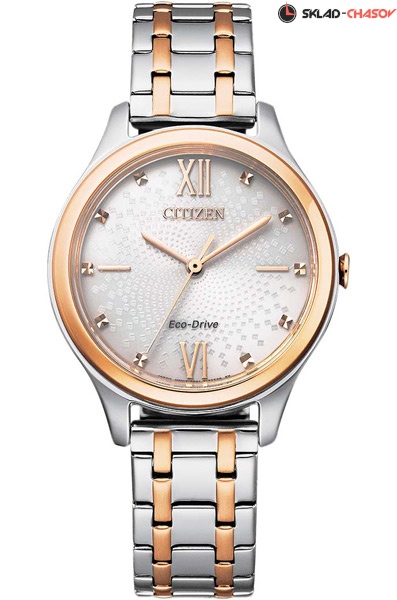 Женские кварцевые наручные часы на солнечной батарее Citizen EM0506-77A коллекции Eco-Drive. Калибр механизма — E031. Аккумулятор данной модели заряжается от любого источника света. Срок работы аккумулятора с полным зарядом — до 180 дней. Примерный срок службы аккумулятора — 10 лет. Присутствует функция информирования о недостаточном заряде. Минеральное стекло. На корпус и браслет частично нанесено стойкое PVD покрытие. Стальной браслет.