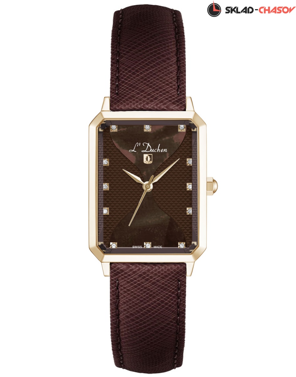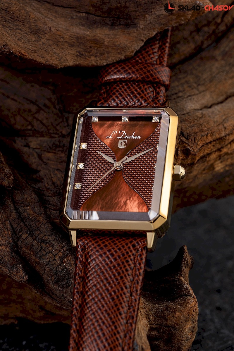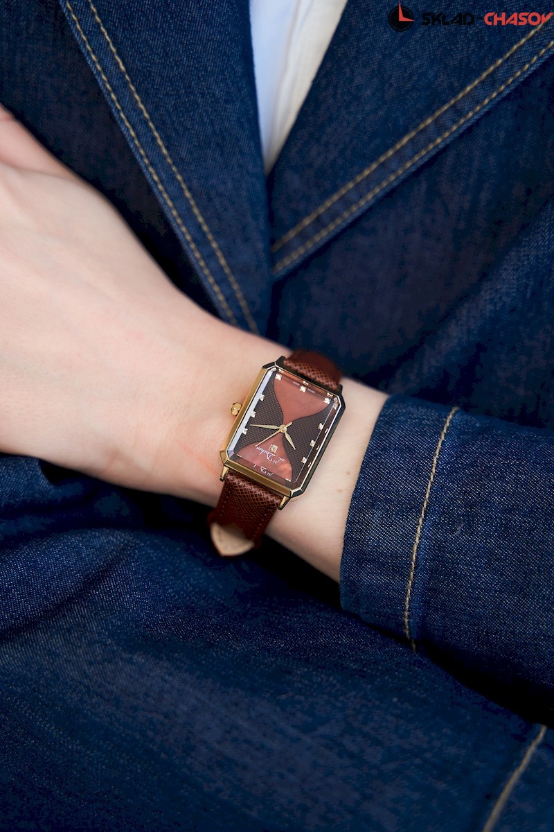 В часах серии Pyramide корпус сложной и эффектной формы — прямоугольник со скошенными углами. Он сделан из нержавеющей стали с PVD-покрытием из желтого золота и зеркальной полировкой. Сапфировое стекло не менее интересно: оно повторяет форму корпуса и обладает гранями, на которых играют лучи света. Коричневый циферблат состоит из двух частей: пластины из натурального перламутра, напоминающие по форме песочные часы, и рисунок гильоше «парижские гвозди». Двенадцать фианитов, каждый в отдельной рамке, выполняют функцию маркеров часов. Ремешок часов сделан из натуральной кожи коричневого цвета с сафьяновым тиснением. Стальная застежка-клипса украшена логотипом бренда. Часы Pyramide, изящные и необычные, станут тем самым аксессуаром, с которым любой образ заиграет новыми красками.