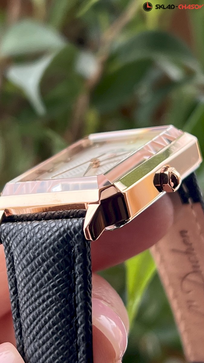 В часах серии Pyramide корпус сложной и эффектной формы — прямоугольник со скошенными углами. Он сделан из нержавеющей стали с PVD-покрытием из розового золота и зеркальной полировкой. Сапфировое стекло не менее интересно: оно повторяет форму корпуса и обладает гранями, на которых играют лучи света. Белый циферблат состоит из двух частей: пластины из натурального перламутра, напоминающие по форме песочные часы, и рисунок гильоше «парижские гвозди». Двенадцать фианитов, каждый в отдельной рамке, выполняют функцию маркеров часов. Ремешок часов сделан из натуральной кожи черного цвета с сафьяновым тиснением. Стальная застежка-клипса украшена логотипом бренда. Часы Pyramide, изящные и необычные, станут тем самым аксессуаром, с которым любой образ заиграет новыми красками.