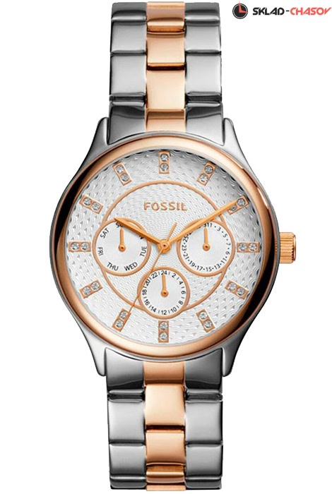 Женские кварцевые наручные часы Fossil BQ1564 коллекции Modern Sophisticate. На данной модели отображается дата, день недели и время суток (24-х часовая шкала). Циферблат украшен камнями. Стальной браслет. На корпус и браслет частично нанесено стойкое PVD покрытие. Водонепроницаемость WR50 (5 атм).