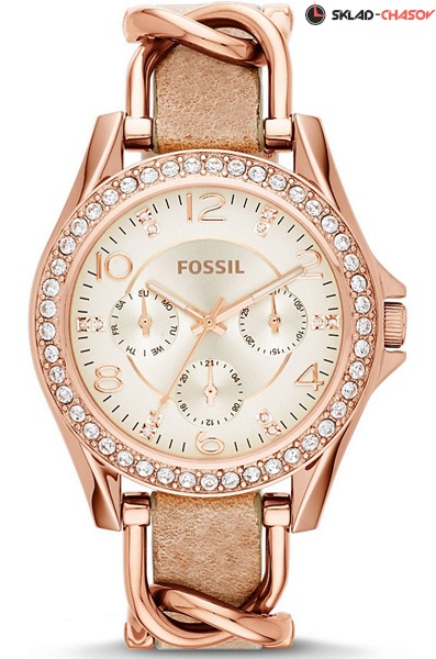 Женские кварцевые наручные часы Fossil ES3466. На данной модели отображается дата, день недели и время суток (24-х часовая шкала). Корпус украшен камнями. Стрелки покрыты люминесцентным напылением (светятся в темноте). Водонепроницаемость WR100 (10 атм).
