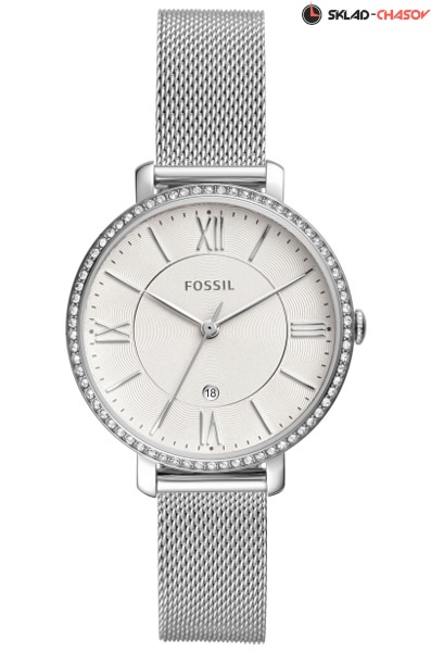 Женские кварцевые наручные часы Fossil ES4627. На данной модели отображается текущая дата. Стальной браслет с миланским плетением. Корпус украшен кристаллами. Водонепроницаемость WR50 (5 атм).