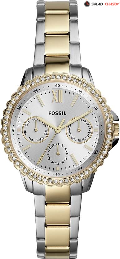 Стильные женские часы Fossil с отображением даты, дня недели и текущего времени в 24-х часовом формате на отдельных малых циферблатах. Корпус украшен кристаллами. Заводная головка с защитой. Браслет с раскладывающейся застежкой и системой быстрой замены. Гарантия 2 года.