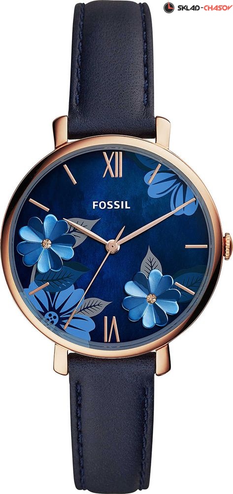 Женские наручные часы Fossil с циферблатом, декорированным цветами с двумя кристаллами. Кожаный ремешок с системой быстрой замены и классической застежкой. Гарантия 2 года.
