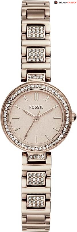 Миниатюрные женские наручные часы Fossil в круглом корпусе. Корпус и браслет украшены кристаллами. Гарантия 2 года.