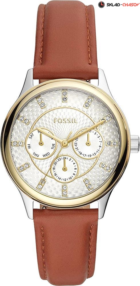 Женские наручные часы Fossil на коричневом кожаном ремешке. На отдельных циферблатах отображаются день недели, число и текущее время в 24-х часовом формате. Циферблат украшен узором и кристаллами. Завинчивающаяся задняя крышка. Кожаный ремешок с классической застежкой и системой быстрой замены. Гарантия 2 года.