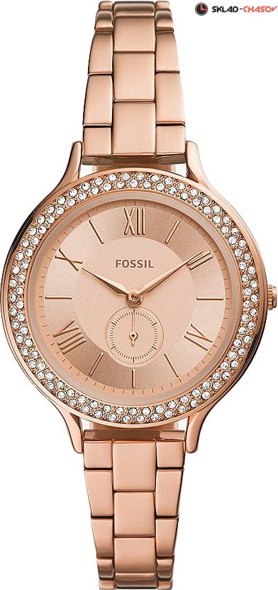 Элегантные наручные часы Fossil с круглым корпусом и браслетом. Секундная стрелка вынесена на отдельный циферблат. Корпус украшен кристаллами. Браслет с раскладывающейся застежкой. Гарантия 2 года.