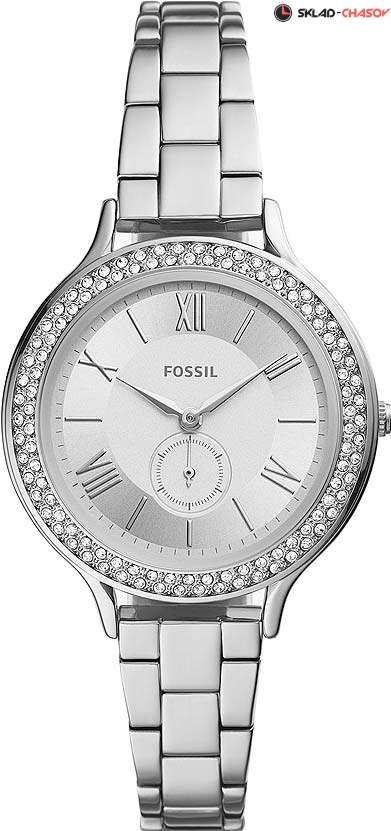 Элегантные наручные часы Fossil с круглым корпусом и браслетом. Секундная стрелка вынесена на отдельный циферблат. Корпус украшен кристаллами. Браслет с раскладывающейся застежкой. Гарантия 2 года.