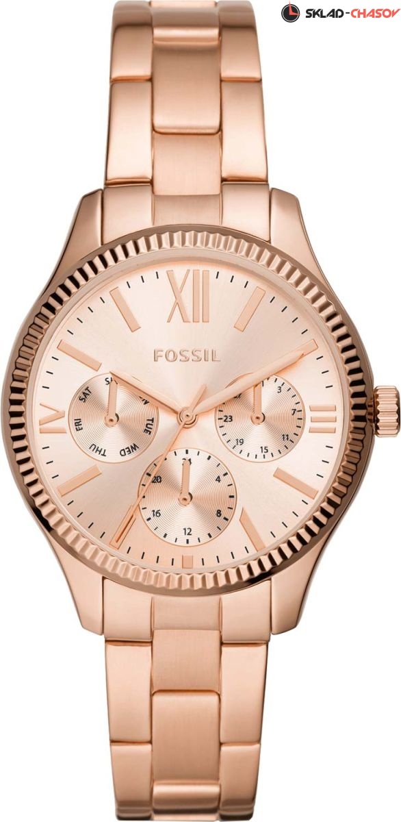 Стильные женские наручные часы Fossil с круглым корпусом и стальным браслетом. На отдельных циферблатах отображаются дата, день недели и текущее время в 24-х часовом формате. Браслет с раскладывающейся застежкой. Гарантия 2 года.