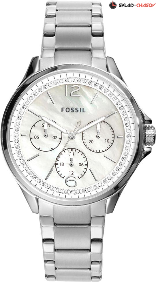 Стильные наручные часы Fossil Sadie на стальном браслете. Перламутровый циферблат украшен кристаллами. На отдельных циферблатах отображаются день недели, число и текущее время в 24-х часовом формате. Браслет с раскладывающейся застежкой. Гарантия 2 года.