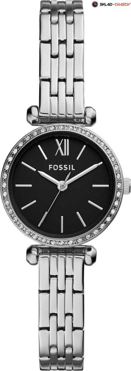 Миниатюрные женские наручные часы Fossil в круглом корпусе серебристого цвета, украшенном кристаллами. Гарантия 2 года.