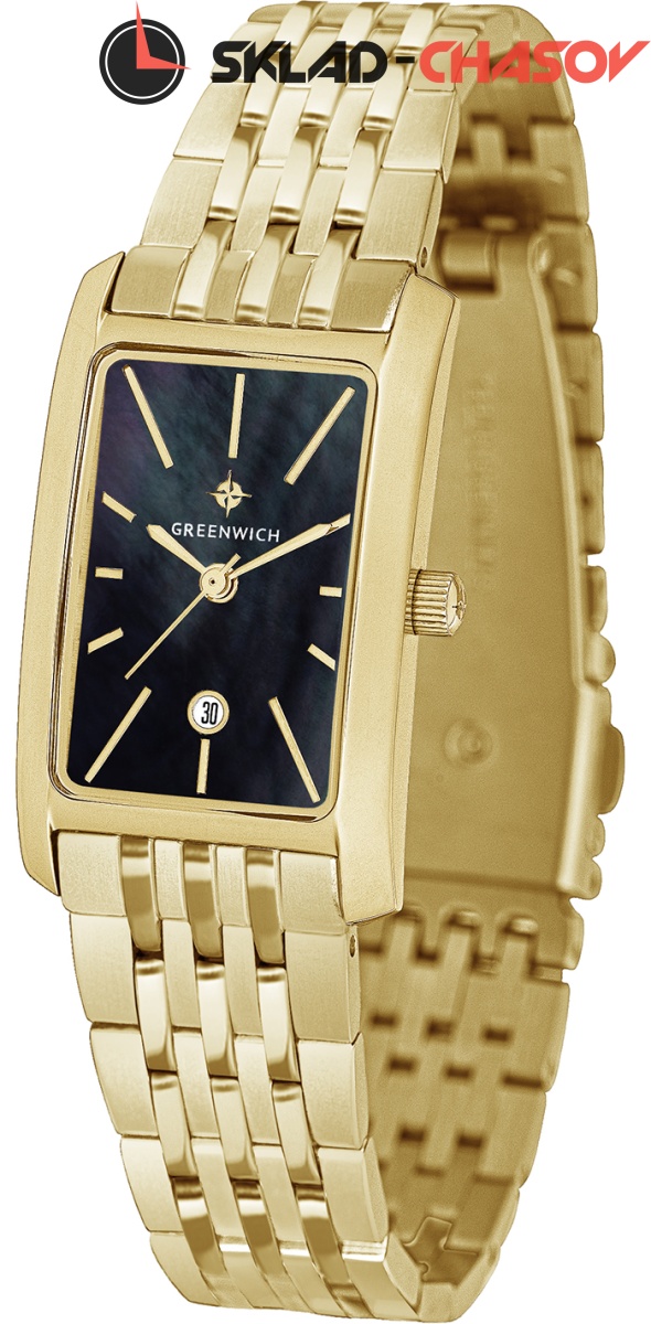 Часы серии Vesta в корпусе прямоугольной формы подчеркивают изящность запястья и точно понравятся тем, кто предпочитает классический стиль или одежду в стиле casual. Часы, минуты, секунды и дата — все это вмещает черный циферблат с деликатным сиянием натурального перламутра. Браслет модели из нержавеющей стали с PVD-покрытием из желтого золота привлекает чередованием разных видов полировки: зеркальной и матовой.