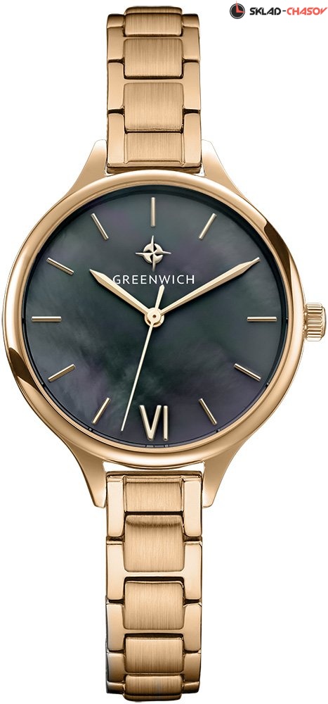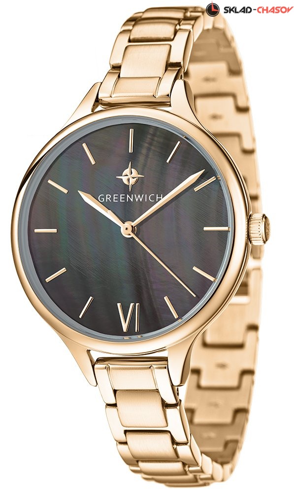 Задняя крышка часов украшена изображениями «розы ветров» и корабля, который является символом марки Greenwich.