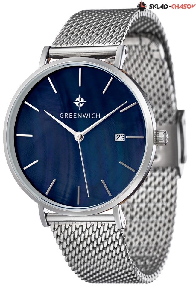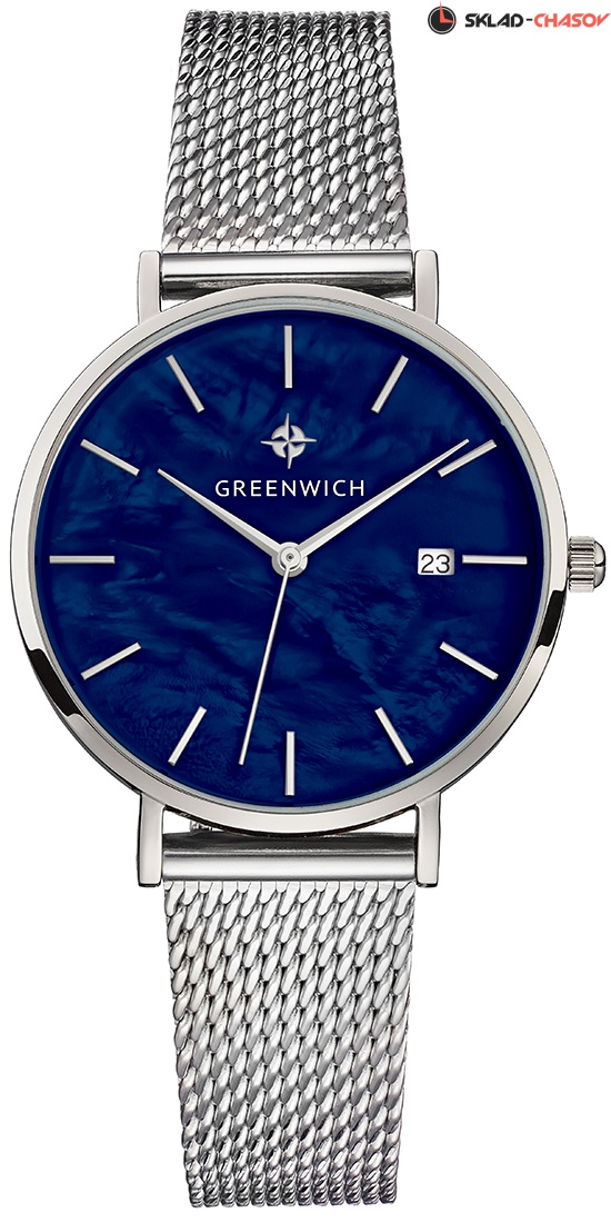 Задняя крышка часов украшена изображениями «розы ветров» и корабля, который является символом марки Greenwich.