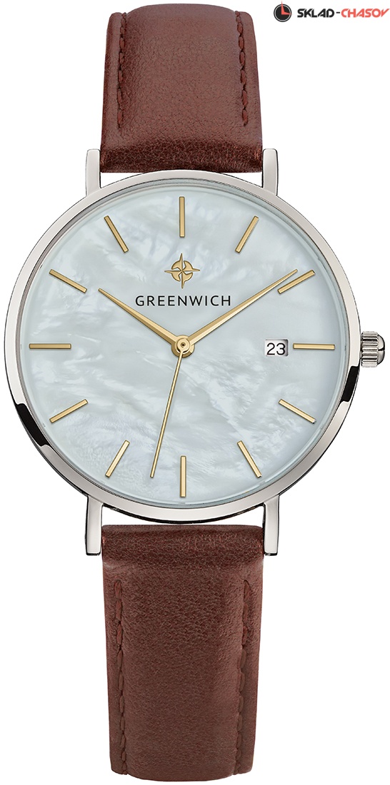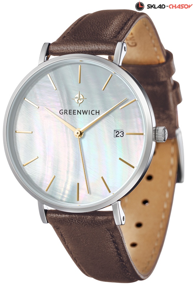 Задняя крышка часов украшена изображениями «розы ветров» и корабля, который является символом марки Greenwich.