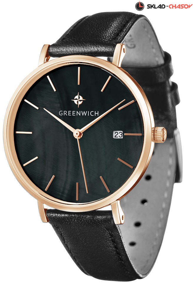 Задняя крышка часов украшена изображениями «розы ветров» и корабля, который является символом марки Greenwich.