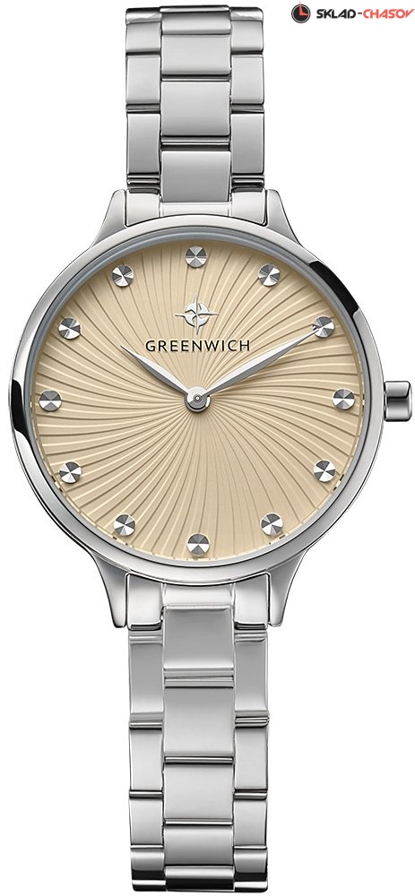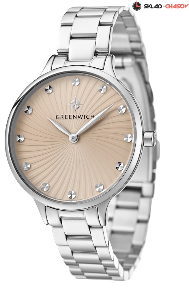 Задняя крышка часов украшена изображениями «розы ветров» и корабля, который является символом марки Greenwich.