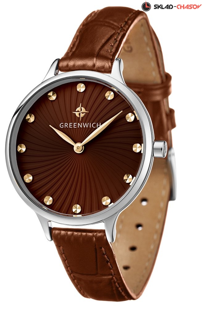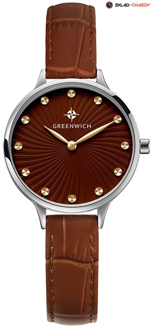 Задняя крышка часов украшена изображениями «розы ветров» и корабля, который является символом марки Greenwich.