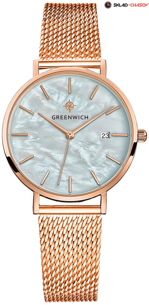 Женские часы серии Shell сочетают в себе элегантность и минимализм. Корпус часов изготовлен из нержавеющей гипоаллергенной стали, которая дополнена PVD-покрытием из розового золота. Нижняя часть корпуса заужена. Он выглядит тонким и изящно смотрится на руке. Размер корпуса 35 мм. В часах используется японский кварцевый механизм. Циферблат часов выполнен из натурального перламутра, поэтому каждая модель уникальна и неповторима. Перламутр – это камень органического происхождения, получаемый из раковин моллюсков. Рисунок каждой раковины прекрасен и индивидуален. В процессе производства часть раковины срезается и наклеивается на латунную часть циферблата. На циферблате расположены часовая, минутная, секундная стрелки и индикатор даты. Индексы часов изготовлены вручную и закреплены на двух штифтах. Циферблат надежно защищен минеральным стеклом. На часах установлен стальной браслет миланского плетения. Логотип марки – изображение «розы ветров» - символизирует удачу и новые открытия. Он расположен на циферблате, заводной головке и внутренней части ремешка. Задняя крышка часов украшена изображениями «розы ветров» и корабля, который является символом марки Greenwich
