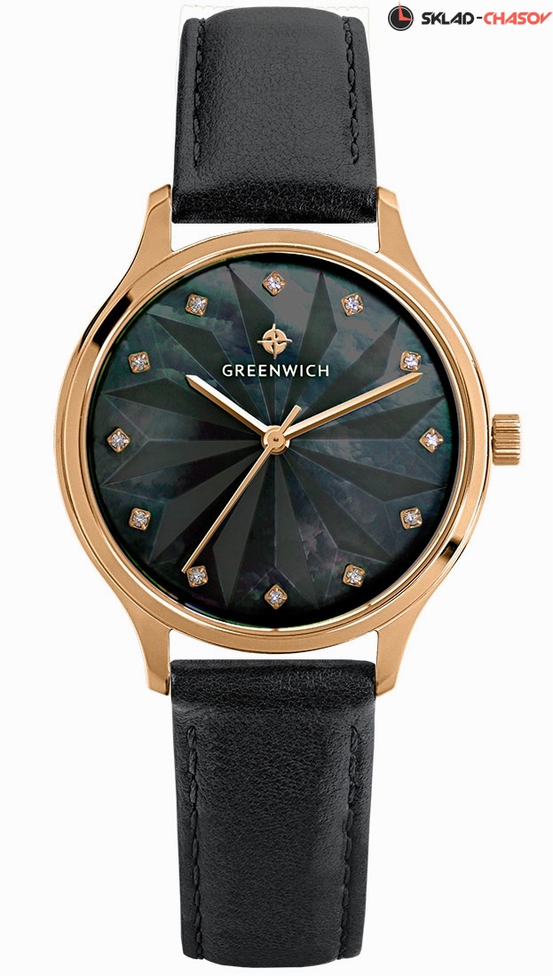 Модель установлена на ремешок из натуральной кожи черного цвета с эффектом «металлик». Застежка-пряжка украшена логотипом бренда.