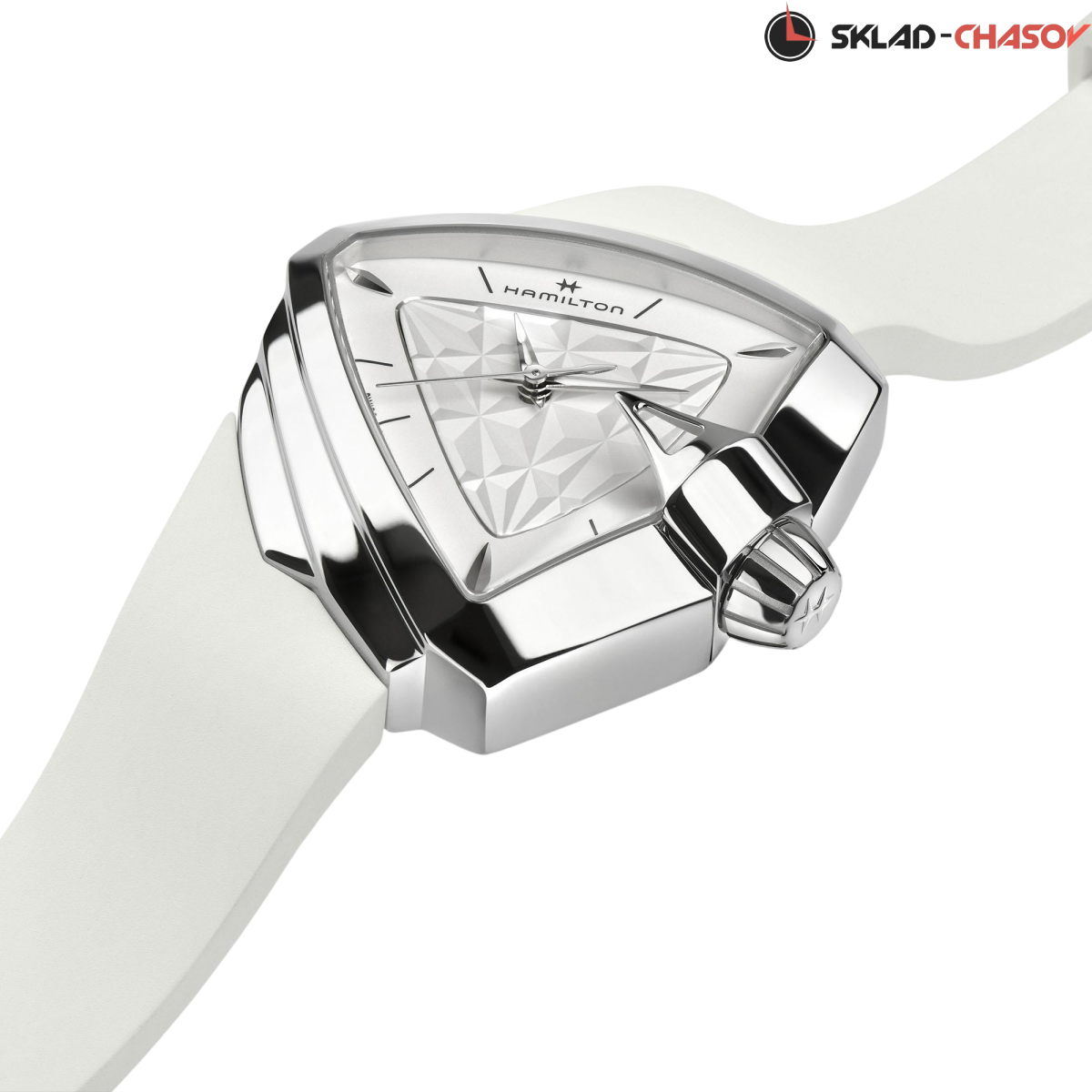 Циферблат Ventura S Quartz дополнен рисунком в виде оптической 3D-иллюзии и каучуковым ремешком в тон.