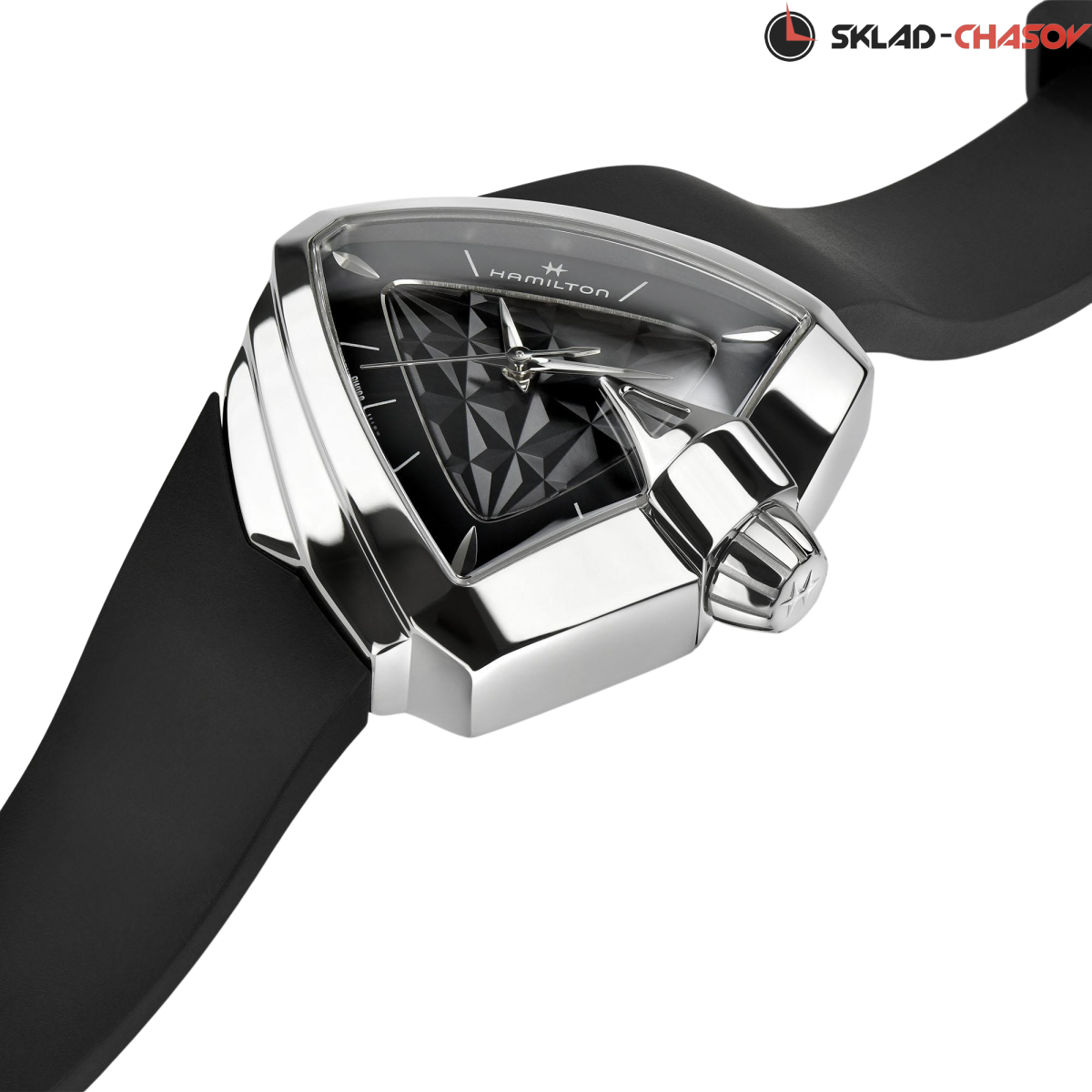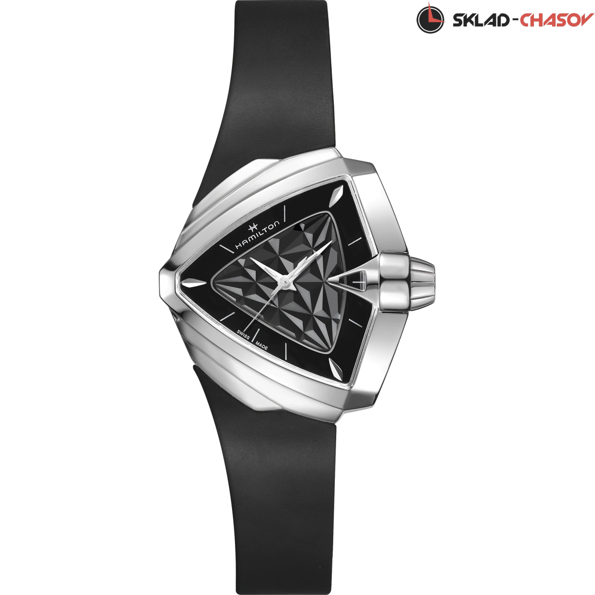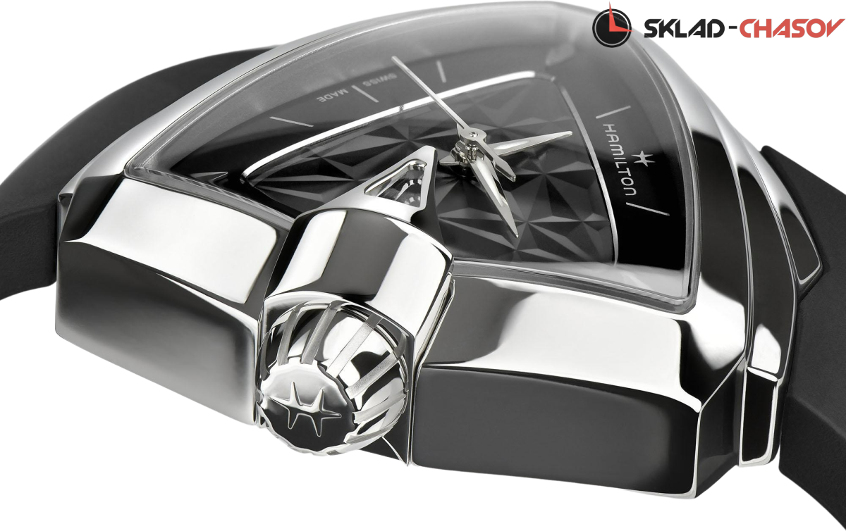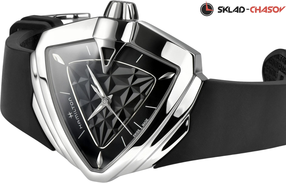 Циферблат Ventura S Quartz дополнен рисунком в виде оптической 3D-иллюзии и каучуковым ремешком в тон.
