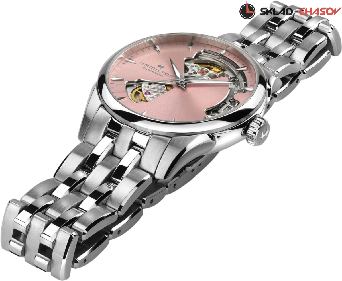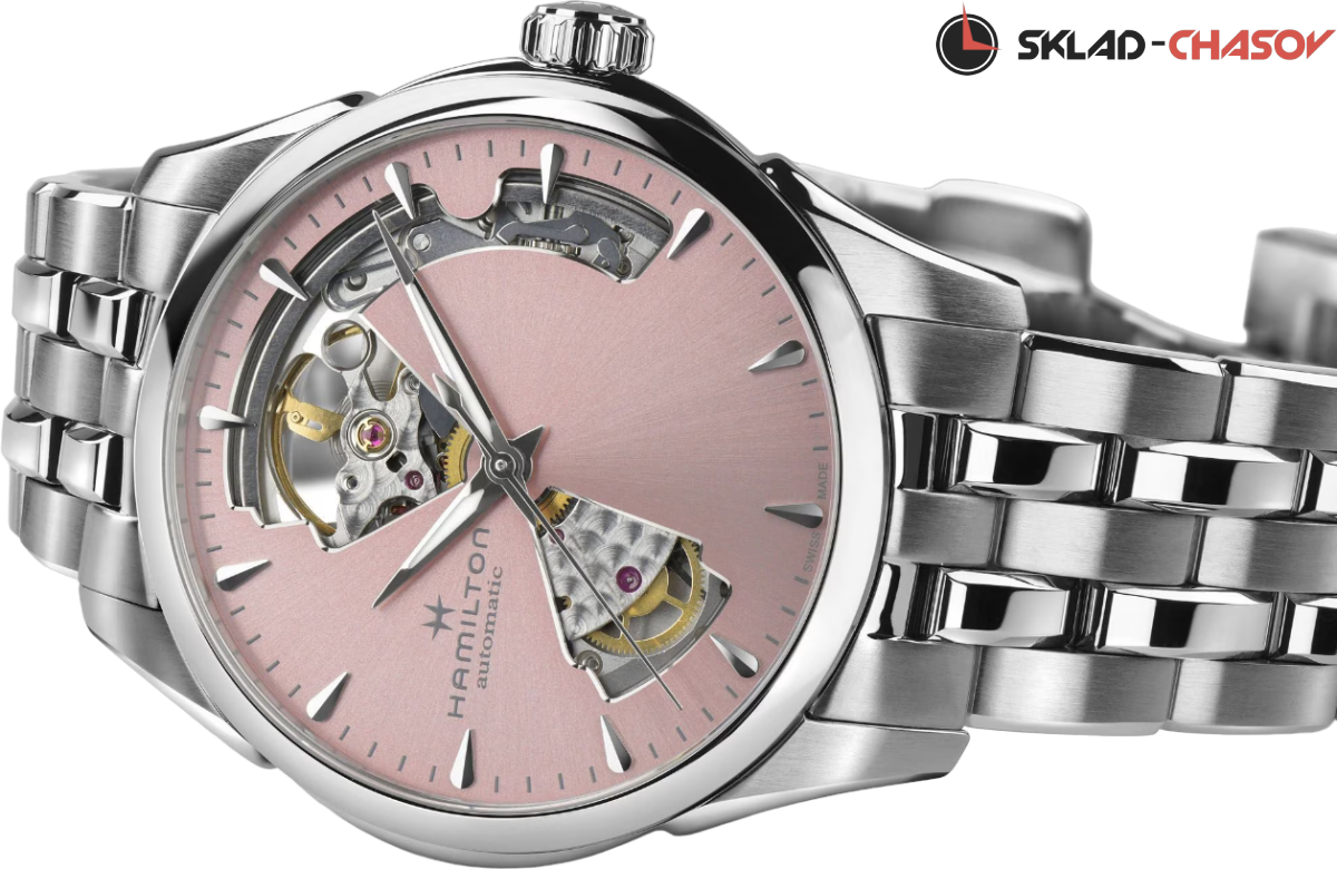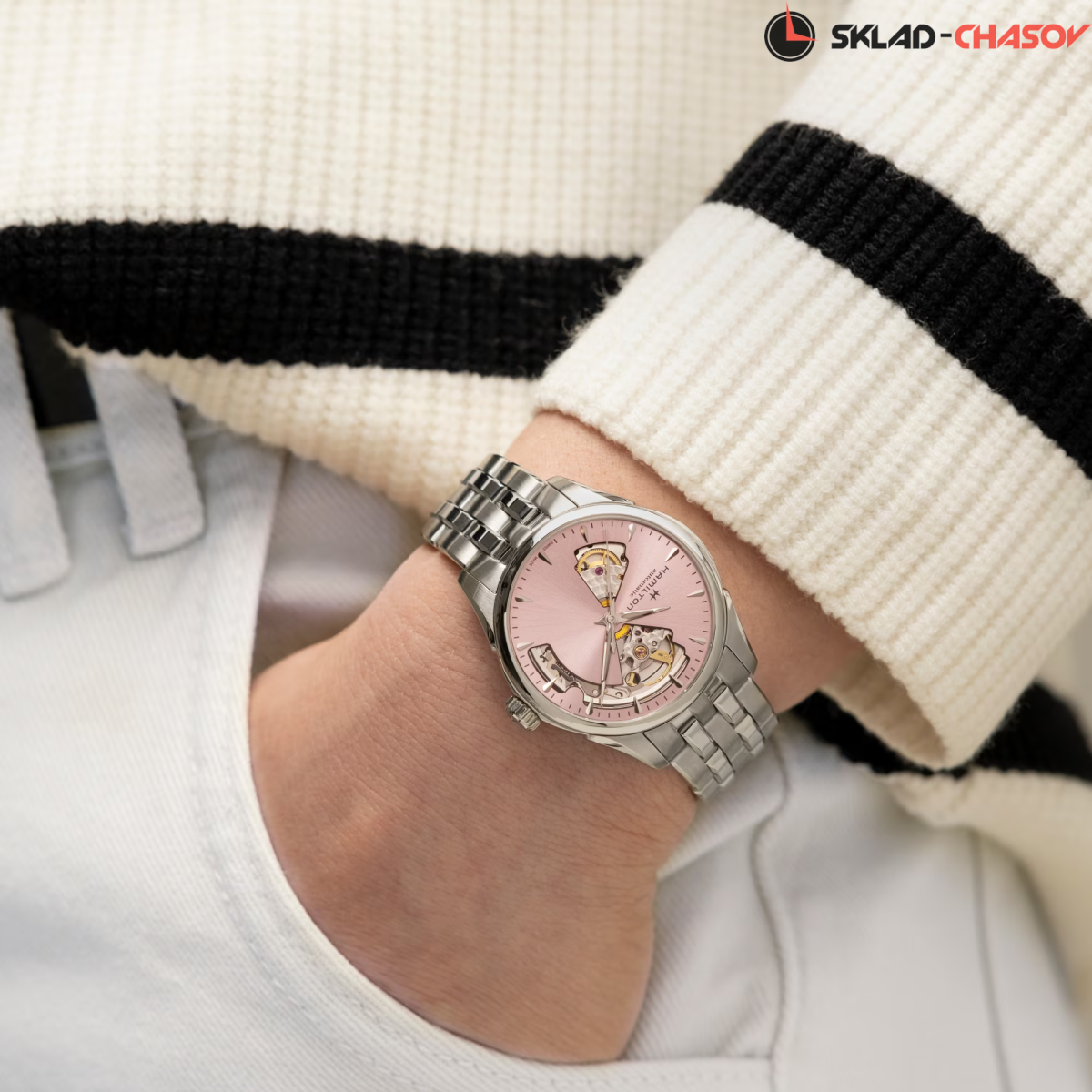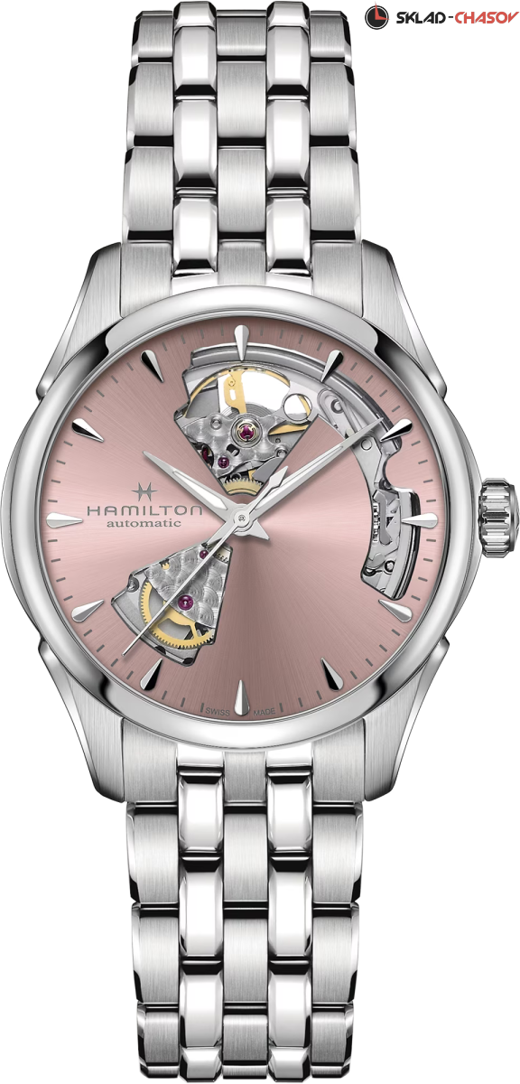 Женская механическая модель с автоподзаводом, скелетонированный циферблат позволяет наблюдать работу механизма. Индикация часов, минут и секунд центральными стрелками.