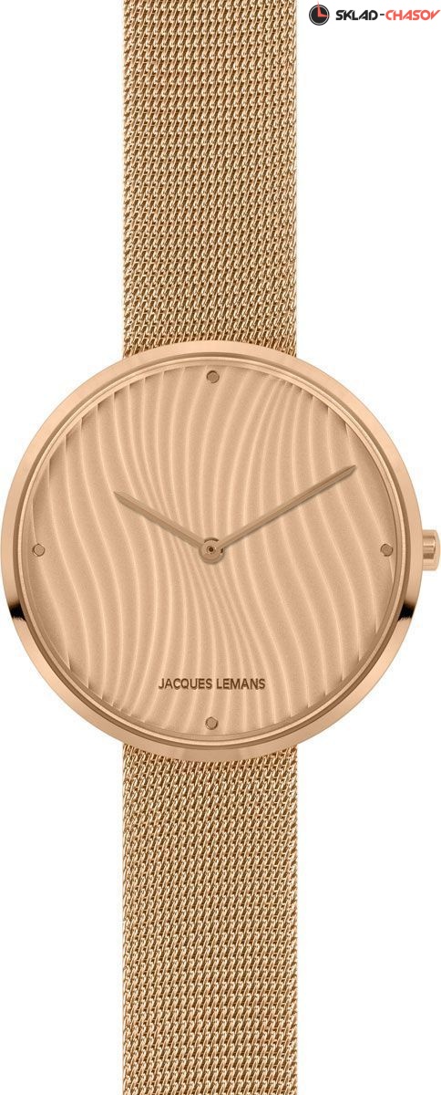 Дизайнерские часы Jacques Lemans не только показывают точное время (внутри скрыт кварцевый механизм, двигающий стрелки часов и минут), но и служат настоящим украшением любого образа. Прочное PVD-покрытие из золота розового оттенка дополняет нержавеющую сталь корпуса. На золотистом циферблате — эффектный рисунок гильоше. Он напоминает волны, которые жаркий ветер оставляет на песчаных барханах. Аккуратными точками выделены 3, 6, 9 и 12 часов. Ударопрочное минеральное стекло Crystex надежно защищает циферблат модели. Стальной браслет миланского плетения очень удобно лежит на руке: он одновременно гибкий и прочный. С помощью специальной «плавающей» застежки его длину можно регулировать самостоятельно.