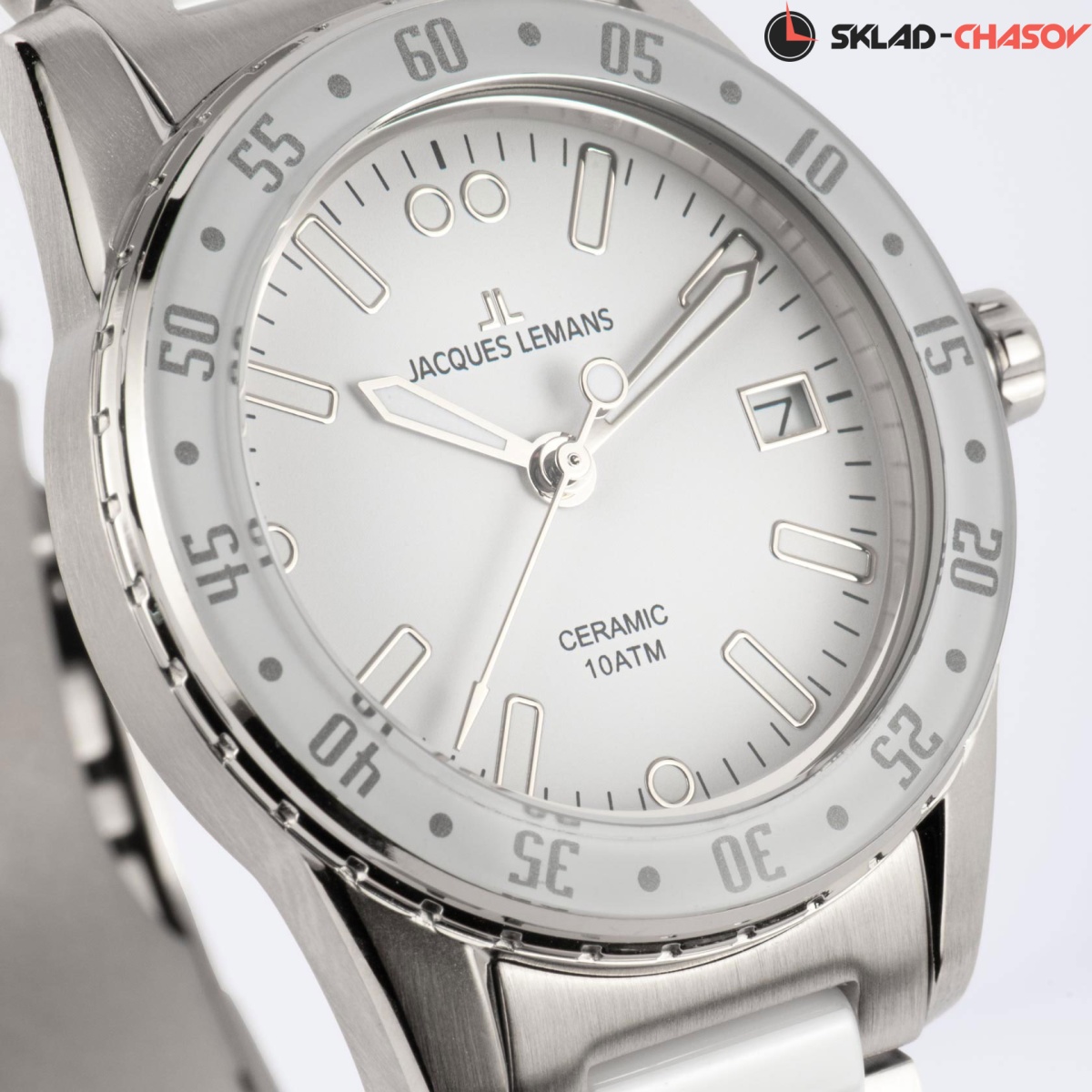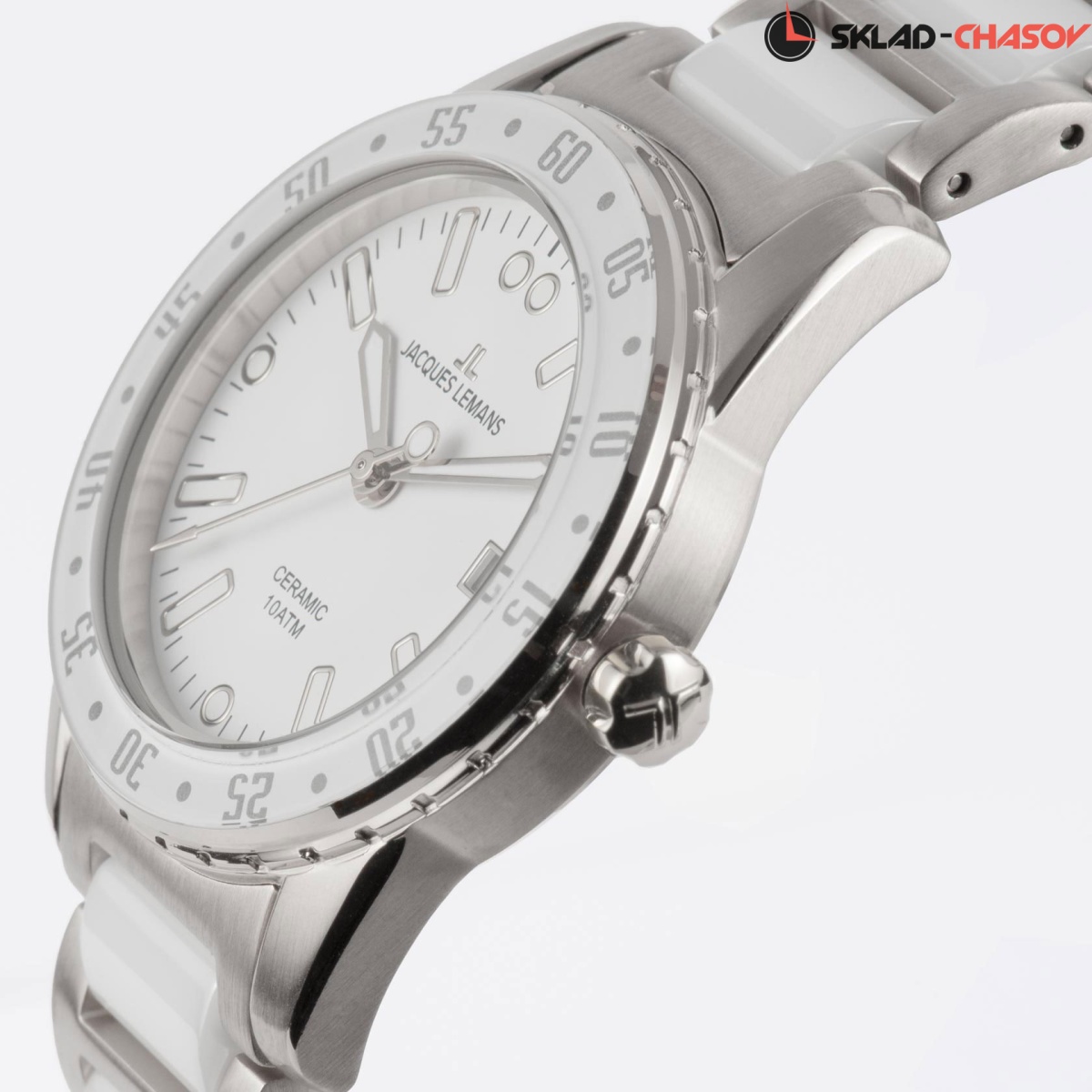 Женские кварцевые часы Jacques Lemans. Корпус выполнен из стали, браслет выполнен из стали и керамики. Стекло минеральное Crystex. Размер корпуса 34 мм. Водозащита 10 АТМ.