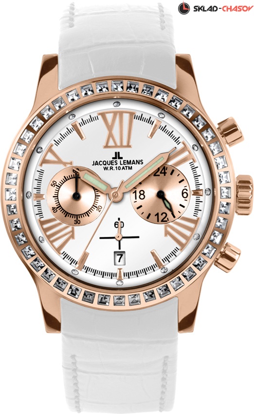 Кварцевый хронограф Jacques Lemans блестяще сочетает женственность и спортивный стиль. Корпус из нержавеющей стали дополняют кристаллы знаменитого бренда Swarovski, которые надежно закреплены на безеле и циферблате. Хорошо читаемые стрелки часов и минут покрыты специальным люминесцентным составом: даже в темноте вы легко определите время. На ярком белом циферблате продуманно расположились дополнительные индикаторы: 60-минутный накопитель, вынесенная стрелка секунд, индикатор 24-х часов и дата. В модели установлено ударопрочное минеральное стекло Crystex. Водостойкость составляет 10 АТМ. PVD-покрытие из розового золота позволяет легко комбинировать часы с вашими любимыми аксессуарами. Благодаря этой технике нанесения, покрытие практически не меняет цвет со временем и сохраняет превосходный вид. Часы дополняет эргономичный ремешок из натуральной кожи белого цвета, он удобно ложится на запястье и позволяет коже дышать.
