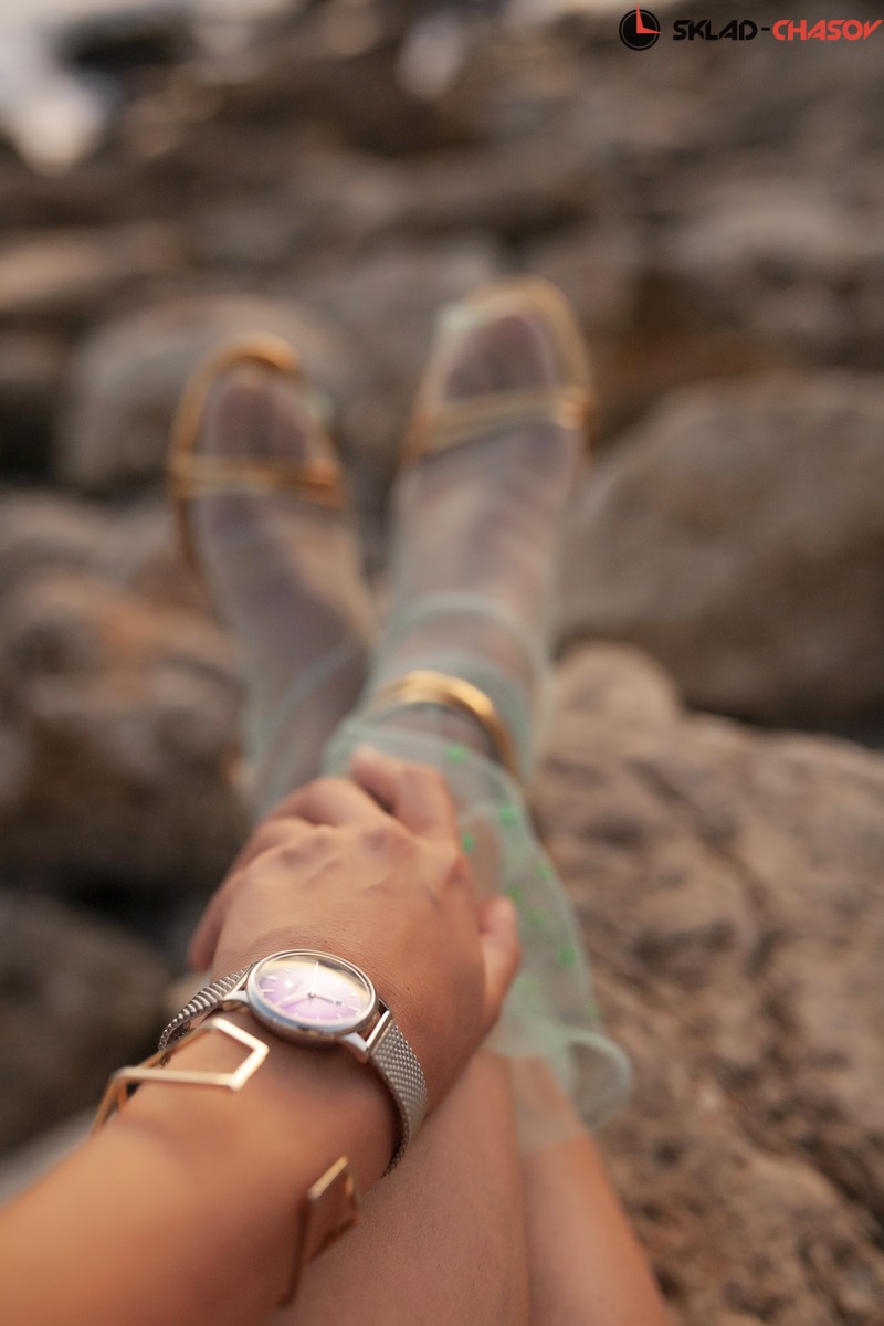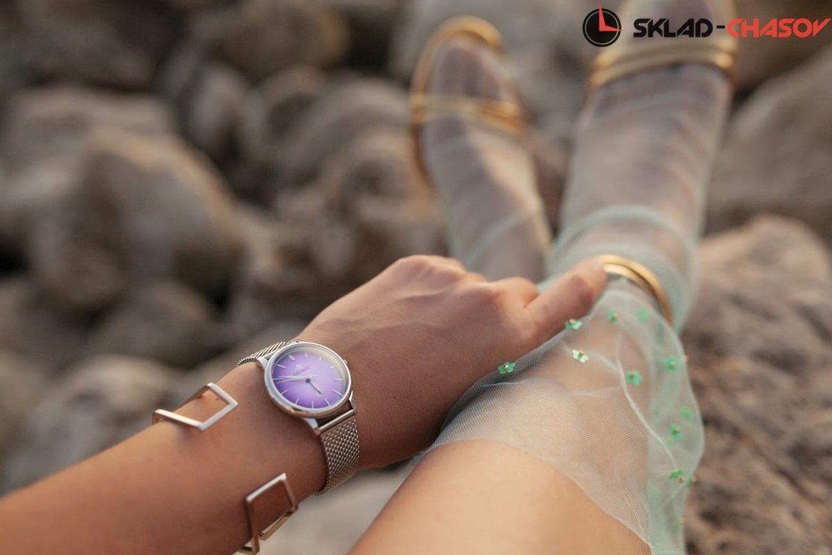 Кварцевые женские часы Космос созданы по канонам стиля «минимализм». На широком циферблате расположены часовая и минутная стрелки. Необычная секундная стрелка имеет выгнутую форму, как и сам циферблат. С первого взгляда обращает на себя внимание цветовой эффект градиента: светло-сиреневый цвет, насыщенный по краям, к центру постепенно светлеет. В позиции «6 часов» находится индикатор даты.